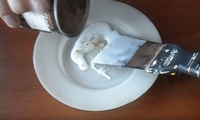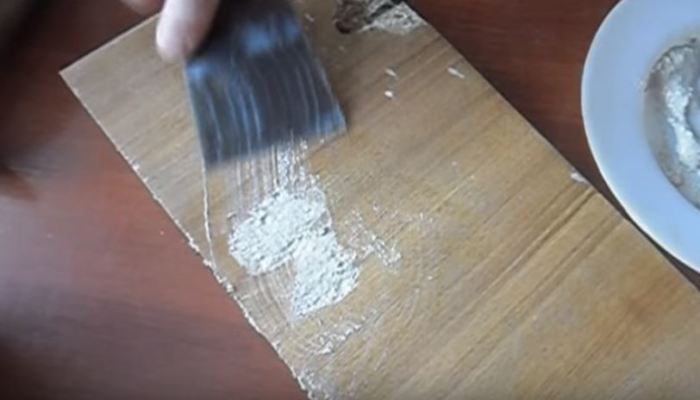 Вся процедура занимает считанные минуты, главное раздобыть необходимые ингредиенты. Лучше всего готовить «кашицу» на тарелке. Все материалы можно получить, распилив сухую деревянную дощечку. Пыль легко получается при помощи напильника. Соотношение пыли и опилок должно быть примерно одинаковым. Клей добавляет на глаз, чтобы получилась густая однородная масса.