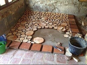 Процесс изготовления такого пола относительно прост и очень похож на укладку тротуарной плитки или брусчатки. Вам нужна твердая, хорошо утрамбованная поверхность, по верх которой насыпаем слой речной гальки (примерно 6-10 см). Затем при помощи резинового молотка приступаем к укладке спилов. Постукиваем и проверяем с помощью уровня, что бы пол был ровный и никакой из спилов не торчал или чересчур не углубился. Как правило, после укладки, расстояние от поверхности спилов до уровня песка составляет около 4-7 см, а расстояние между спилами должно составлять приблизительно от одного до полутора сантиметров.
